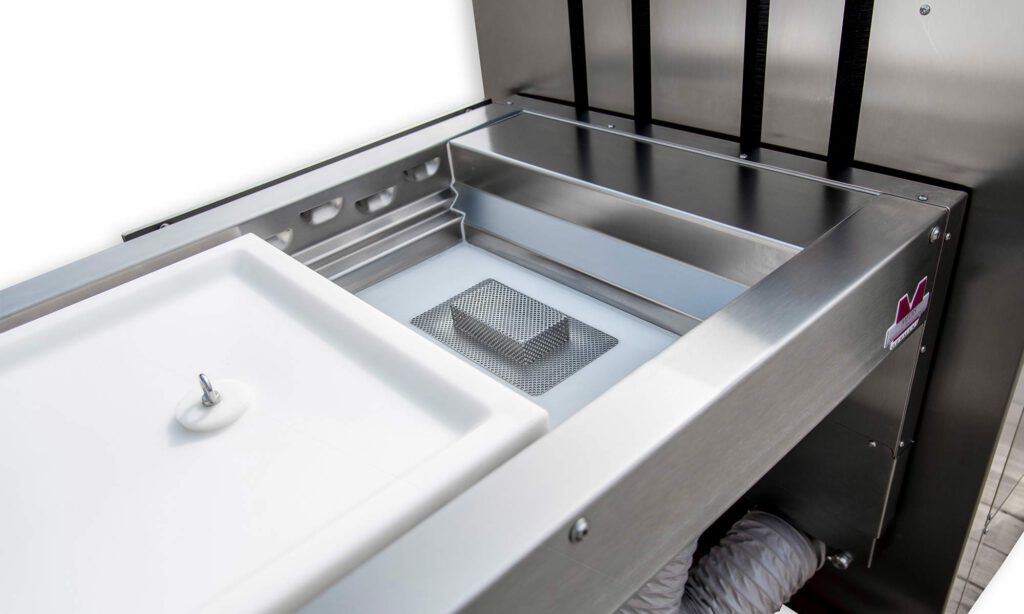 - Transfer-Mulde aus POM mit verschließbarem Ablauf und Gefälle