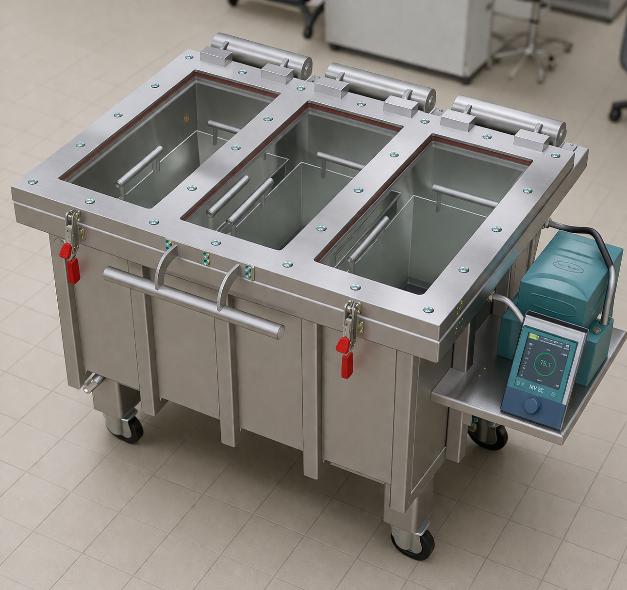 PEG-Imprägnierungsanlage zur Vakuum-Imprägnierung von biologischen Präparaten mit Polyethylenglykol (PEG) bei Raumtemperatur. Einsatzbereiche: Anatomie, Museumspräparation, ebenso geeignet für archäologische Funde. Kammerinnengröße: 1000 × 650 × 540 (mm), Gesamtmaße: 1420 × 1020 × 920 (mm). Kompakte Anlage für sichere und materialschonende PEG-Imprägnierung, ca. 350 Liter Nutzraum. Geschlossenes System mit integrierter Vakuumpumpe.