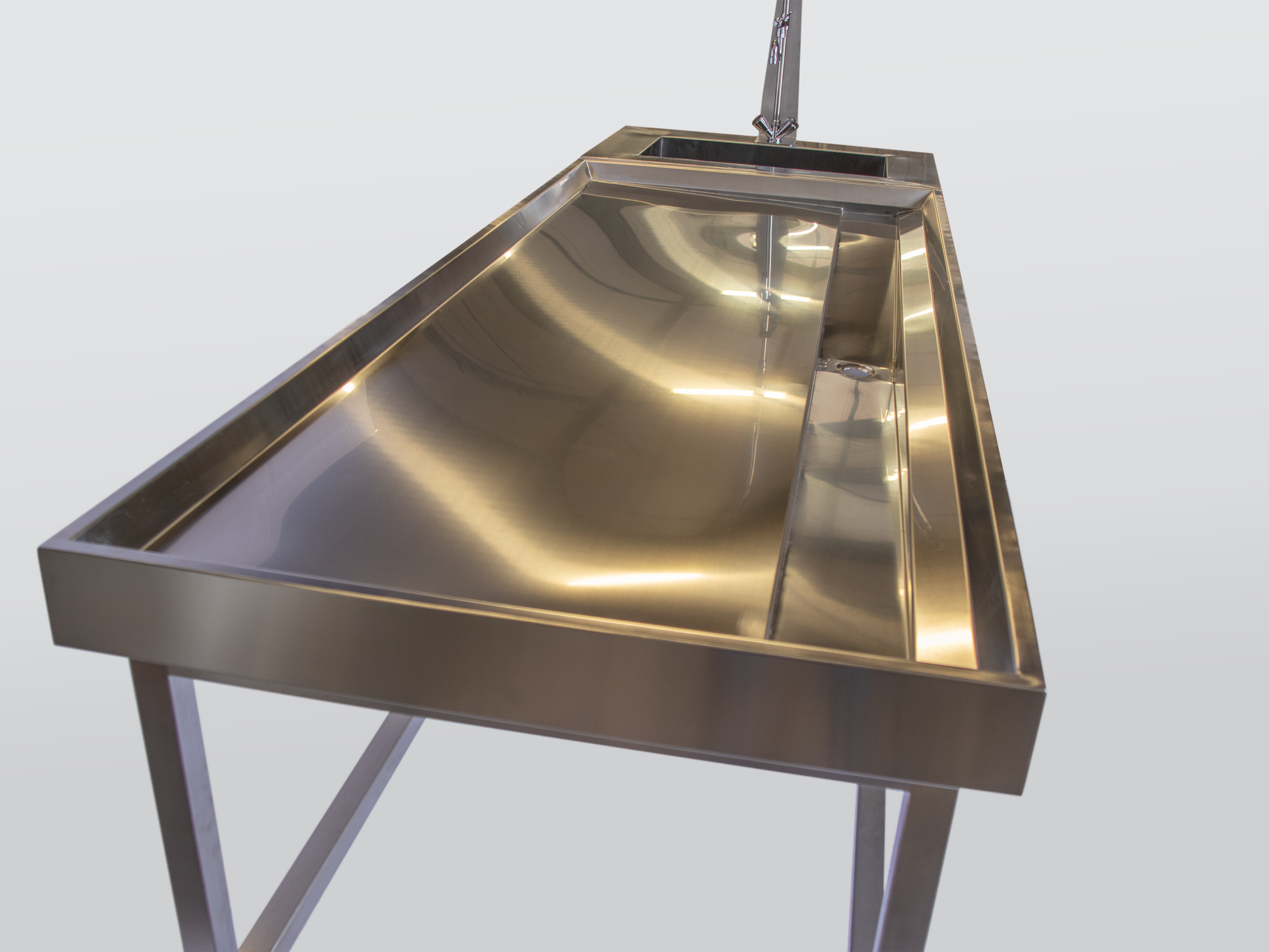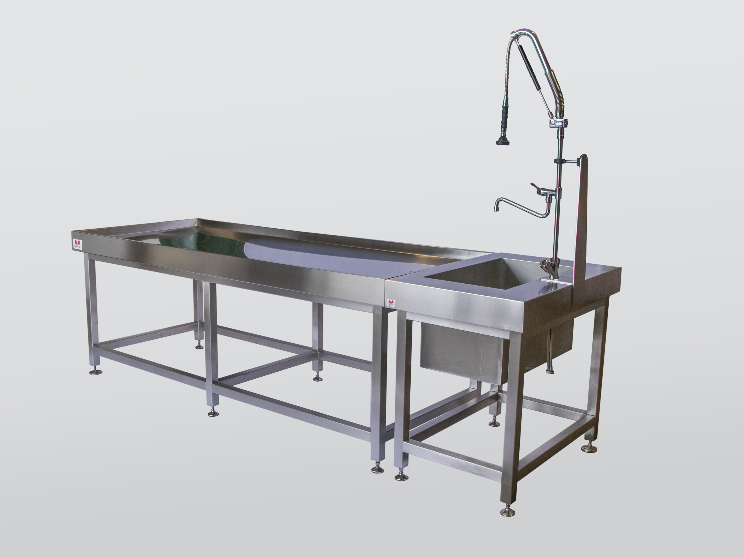 Konstruktion komplett aus Edelstahl EN/DIN 1.4301. Stationäre Tischbauart mit stabilem 6-Fuß-Gestell, optional mit Höhenverstellung. Geneigte Arbeitsfläche mit vorderseitiger Rinne für kontrollierte Flüssigkeitsabführung. Umlaufende Randaufkantung 30 mm hoch. Ein Ablauf DN50 serienmäßig, weitere Abläufe auf Wunsch. Optionaler Spritzschutz an der Rückseite.