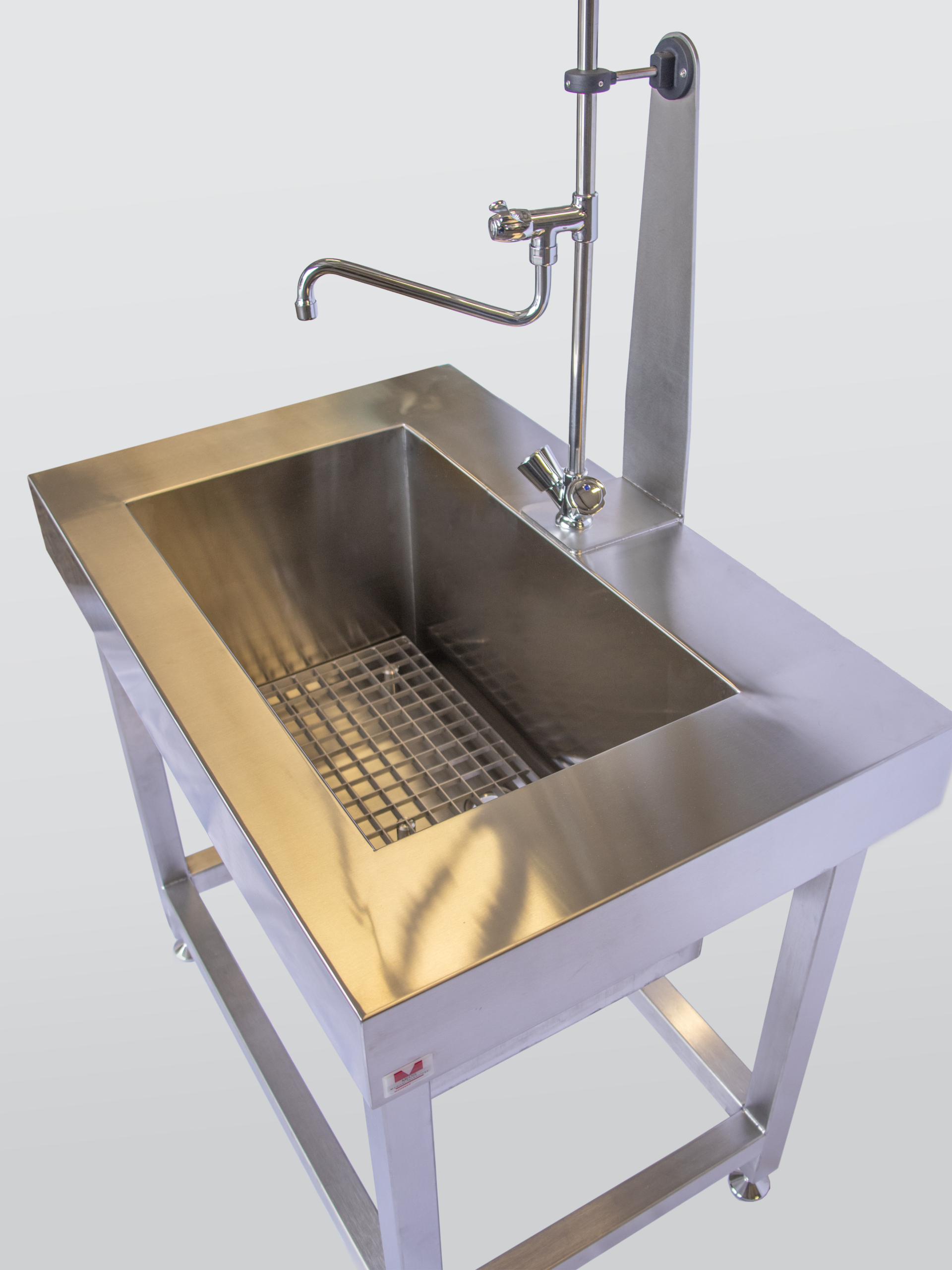 Waschbecken nicht im Tisch integriert, sondern als verschraubtes Beistellbecken lieferbar, wahlweise 1 oder 2 Becken, rechts oder links positionierbar, Standardmaß 600 × 500 × 400 mm, optional mit Auflagegitter. Vorrichtungen, Halterungen und Auflagen für Vakuummatratzen sowie Fixier- und Spannsysteme kundenspezifisch ausführbar.